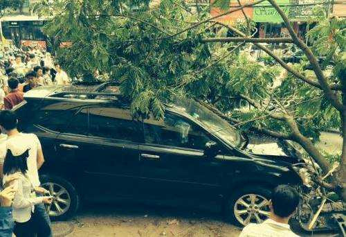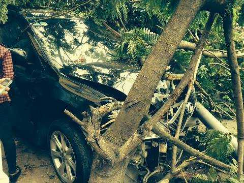 Tại hiện trường, đầu xe ô tô đã dính chặt vào cây cột điện, bị cây đè lên, hư hỏng nặng.