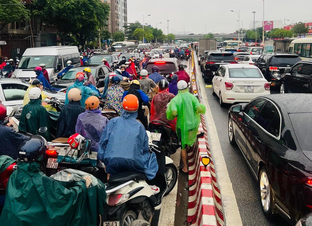 Trên cầu Vĩnh Tuy, hàng trăm xe máy, ô tô đi tràn sang làn đường ngược chiều dẫn đến cảnh hỗn loạn, nhiều tài xế bức xúc vì phải đứng chôn chân hơn 2 tiếng dưới trời mưa.