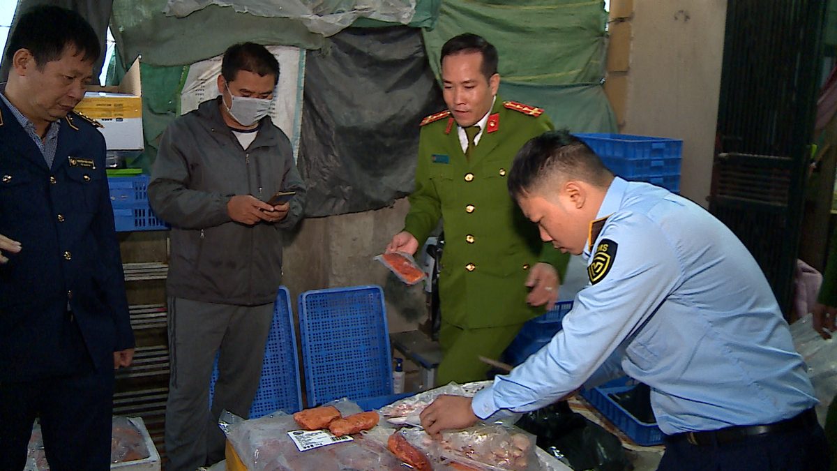 Kiểm tra một cơ sở kinh doanh ở quận Bắc Từ Liêm, Hà Nội, lực lượng chức năng phát hiện gần 1,2 tấn thực phẩm là ức vịt và cánh gà đông lạnh không rõ nguồn gốc.