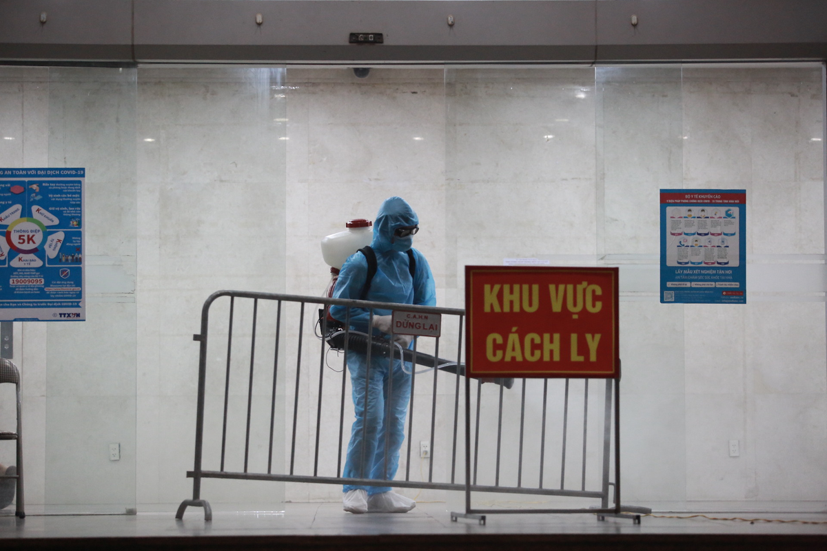 Nhân viên y tế phun khử khuẩn tòa nhà. (Ảnh: Trang Nguyễn)