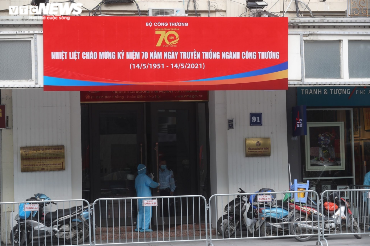 Lực lượng chức năng lập barie trước cửa tòa nhà số 91 phố Đinh Tiên Hoàng, quận Hoàn Kiếm.