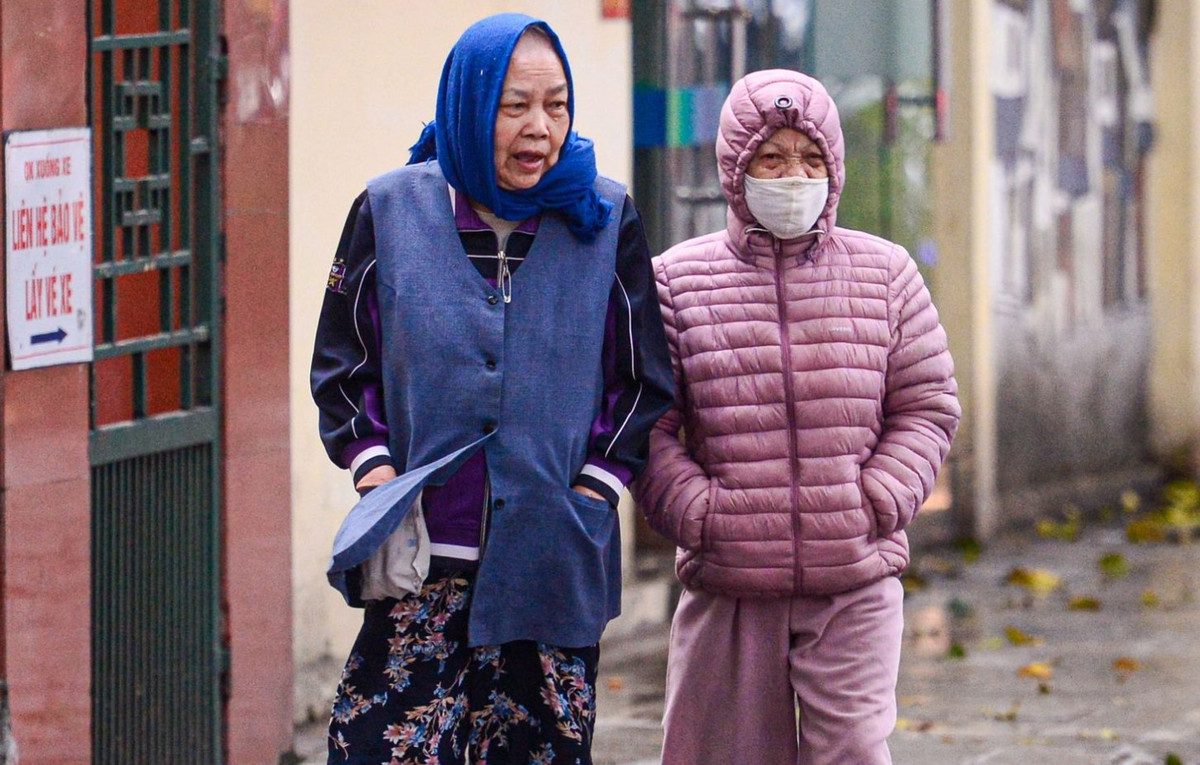Nhiều cụ già phải mặc áo rét, quàng thêm khăn ấm trong buổi sáng đầu tuần.