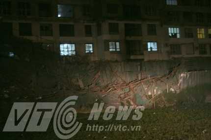 | Hệ thống dàn giáo bị sập xuống ruộng rau muống phía sau tòa nhà. |