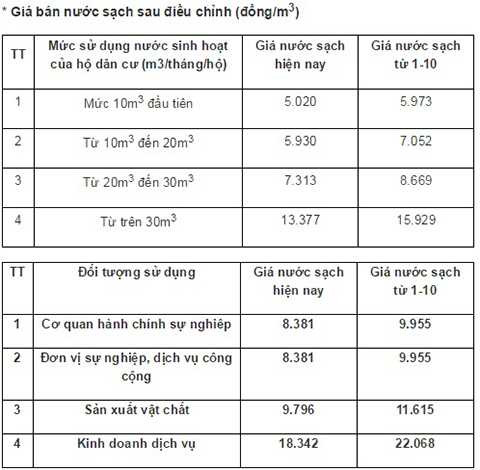Tương tự, giá bán nước sạch cho các cơ quan, đơn vị phục vụ sản xuất, kinh doanh cũng đã được điều chỉnh tăng 19% so với mức giá hiện đang áp dụng.