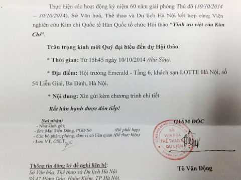| Giấy mời tham dự hội thảo kim chi mừng Ngày Giải phóng Thủ đô có chữ ký của Giám đốc Sở Văn hoá Thể thao và Du lịch. (Ảnh: Tuổi trẻ) |