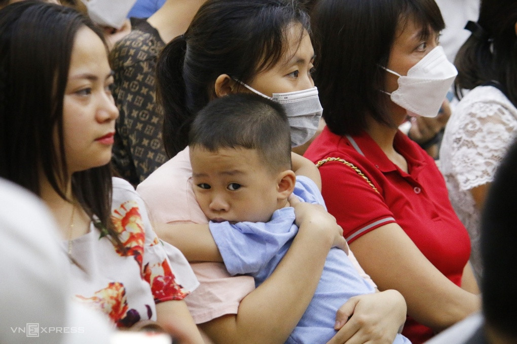 Phụ huynh bế theo con nhỏ đi bốc thăm giành suất học công lập của Trường Mầm non Hoàng Liệt, quận Hoàng Mai. (Ảnh: Vietnamnet)
