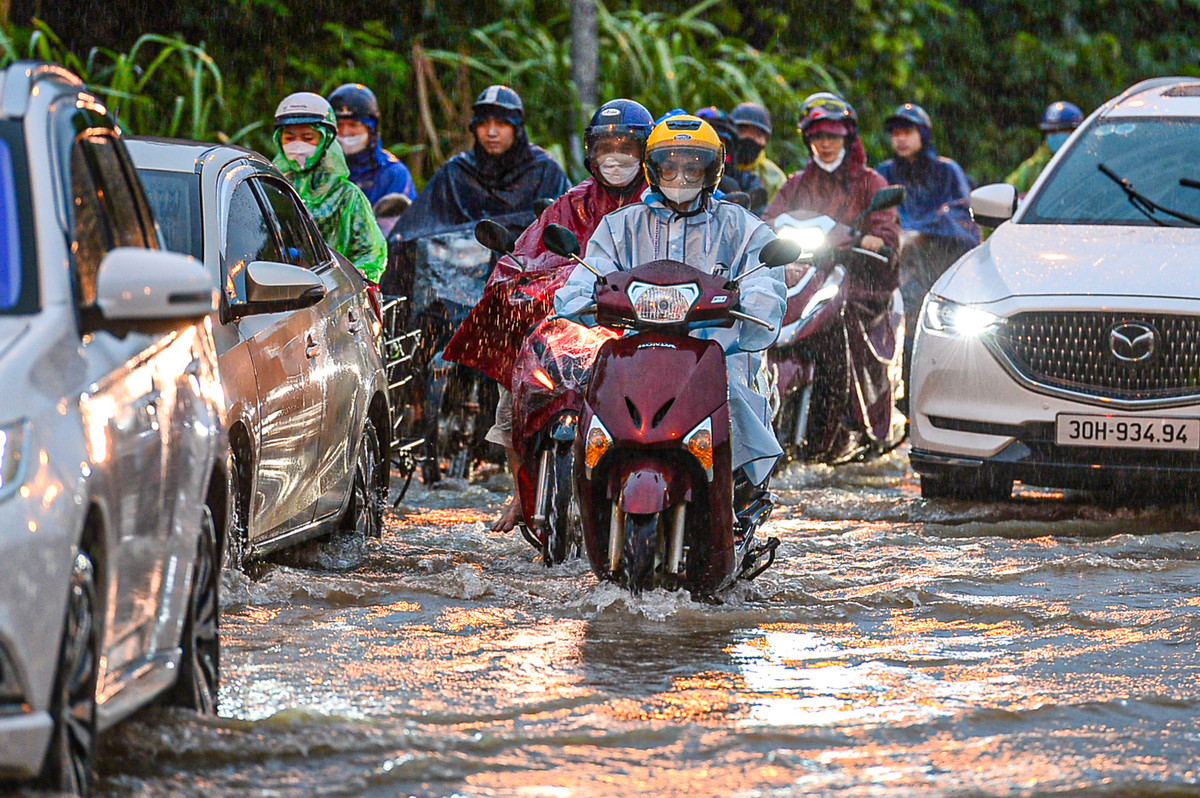 Khoảng 18h30, tuyến đường gom Đại lộ Thăng Long càng ngập sâu, gây ùn tắc hàng km.