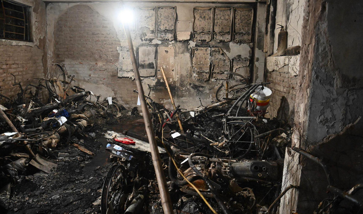 Nhiều xe máy cháy rụi trong vụ cháy chung cư mini ở quận Thanh Xuân.