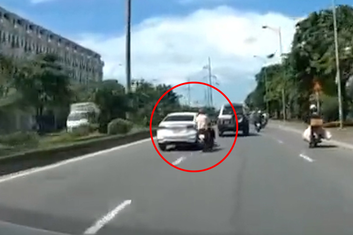Người đi xe máy ngã ra đường sau cú va chạm. (Ảnh: Chụp màn hình)