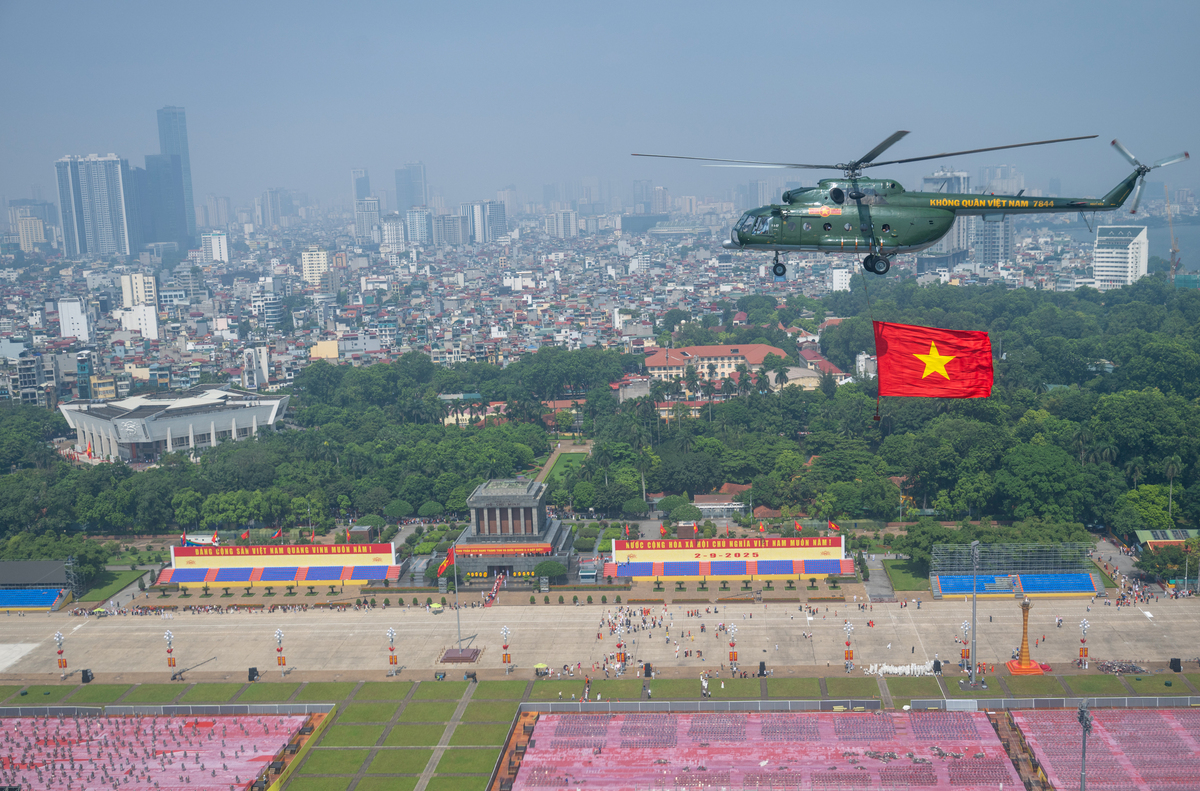 Đội hình trực thăng bay qua sân vận động quốc gia Mỹ Đình, rồi hướng về Quảng trường Ba Đình – nơi sẽ diễn ra lễ diễu binh, diễu hành trọng thể.