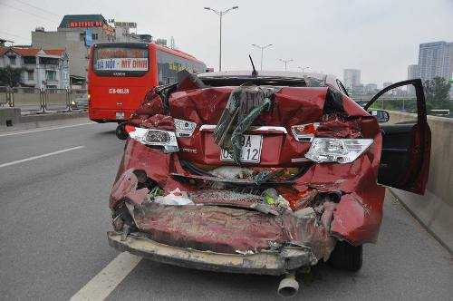 Vụ tai nạn xảy ra vào chiều 31/3 trên đường cao tốc trên cao hướng Linh Đàm đi Phạm Hùng (đoạn qua tòa nhà Keangnam, quận Nam Từ Liêm, Hà Nội) khiến chiếc xe con bẹp dúm, 4 người trong xe may mắn thoát chết.