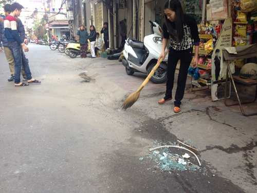 | Người dân thu dọn các mảnh vỡ sau vụ nổ (Ảnh: Minh Chiến) |