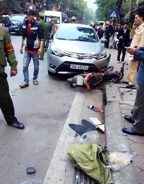 Theo một số nhân chứng, chiếc ô tô mang BKS 30A-482.69 lưu thông trên phố Tô Hiệu bất ngờ mất lái đâm liên hoàn vào hai xe máy trên đường lưu thông theo chiều ngược lại.