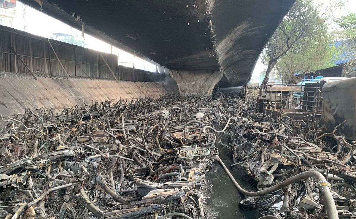Khoảng 500 xe máy cháy rụi tại bại giữ xe dưới gầm cầu Vĩnh Tuy.