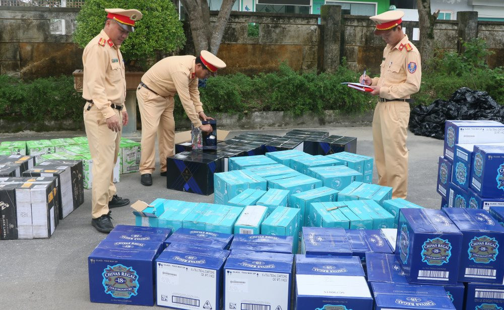 Phòng CSGT Công an Hà Tĩnh vừa thu giữ 1.630 chai rượu không có giấy tờ chứng minh nguồn gốc, dán nhãn Chivas regan, The glenliviet, Black label...