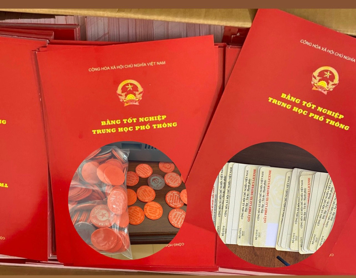 Lực lượng chức năng thu giữ 80 bộ tài liệu giả đã hoàn thiện và 11 con dấu của các cơ quan, tổ chức, 6 bộ máy tính, 7 máy in màu, 1 máy scan, 1 máy ép plastic, 1 máy khắc dấu, hơn 6.000 phôi bằng giấy tờ, 11 điện thoại di động và hơn 10 tài khoản ngân hàng các loại.