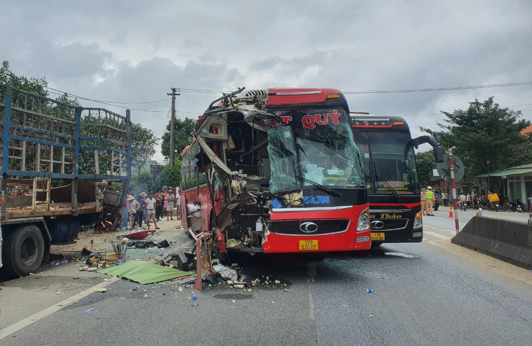 Cú va chạm mạnh khiến 1 người trên xe khách 37B-02005 chết tại chỗ. Nhiều người bị thương được đưa đi bệnh viện.