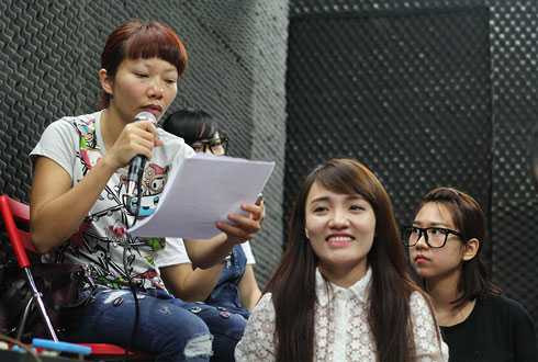 | Cô để mặt mộc và thoải mái ngồi tập nhạc cùng với ban nhạc Anh Em của nhạc sỹ Anh Quân |