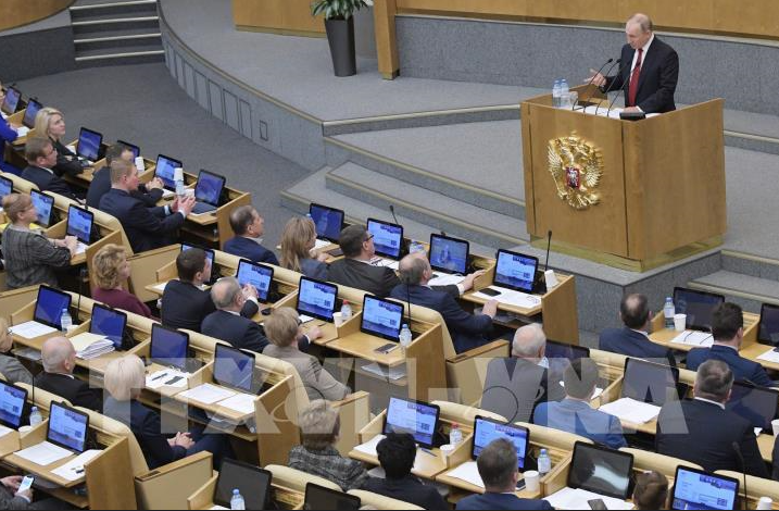 Tổng thống Nga Vladimir Putin phát biểu tại phiên họp của Duma Quốc gia. (Ảnh: THX/TTXVN)