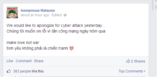 | Lời xin lỗi được hacker Malaysia đăng tải trên địa chỉ Facebook của mình |