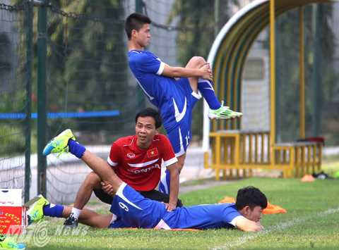 | Bác sĩ Hoàng Nghĩa Dương đang điều trị chấn thương cho Xuân Trường (Ảnh: Quang Minh) |