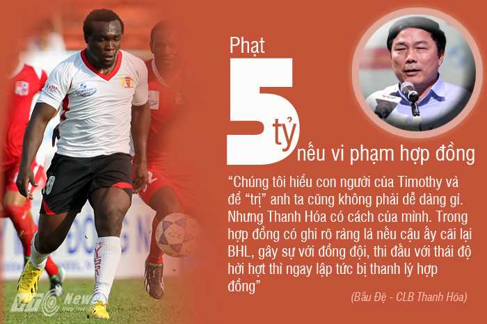 Bầu Đệ khi đó đã tuyên bố: "Chúng tôi hiểu con người Timothy và để trị anh ta cũng không phải dễ dàng gì. Nhưng Thanh Hóa có cách của mình. Trong hợp đồng có ghi rõ ràng, nếu cậu ấy cãi lại Ban huấn luyện, gây sự với đồng đội, thi đấu với thái độ hời hợt thì ngay lập tức bị thanh lý hợp đồng".