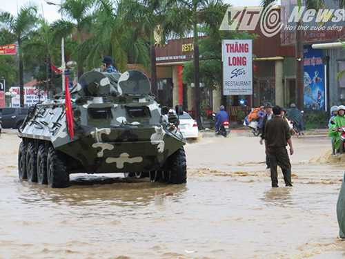 | Hàng trăm cán bộ, chiến sỹ thuộc lực lượng Công an, Quân đội dầm mình trong mưa cùng với xe đặc chủng tham gia giúp đỡ người dân chống chọi với mưa lũ, cứu hộ, cứu nạn - Ảnh MK |