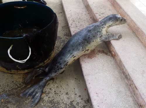| Con hải cẩu chui vào rớ của ngư dân Nguyễn Văn Xu đêm 7/7, được đưa về Đồn Biên phòng Phú Lộc (phường Thanh Khê Tây, quận Thanh Khê, Đà Nẵng) lúc 7 giờ sáng 8/7. |