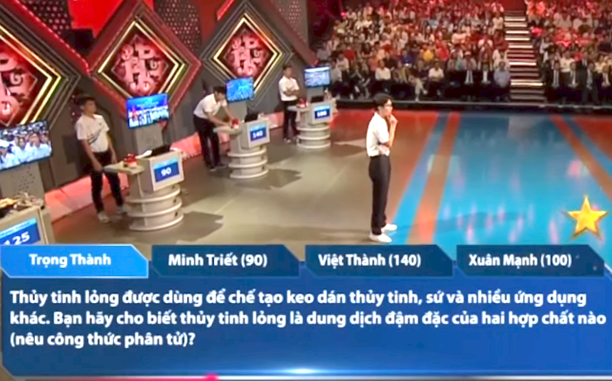 Trong phần thi về đích của thí sinh Nguyễn Trọng Thành (trường THPT chuyên Trần Phú - Hải Phòng) có câu hỏi: "Thủy tinh lỏng được dùng để chế tạo keo dán thủy tinh, sứ và nhiều ứng dụng khác. Bạn hãy cho biết thủy tinh lỏng là dung dịch đậm đặc của hai hợp chất nào (nêu công thức phân tử)?".