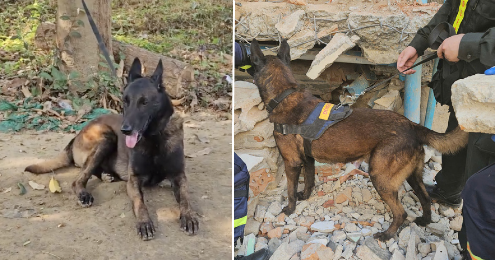 Cảnh khuyển của đoàn cứu hộ Việt Nam tìm kiếm người mắc kẹt sau động đất ở Myanmar. (Ảnh: Lê Hoàng)