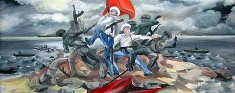 | Bức tranh miêu tả cuộc chiến đấu bảo vệ Gạc Ma, được treo trong phòng truyền thống Vùng IV Hải quân |