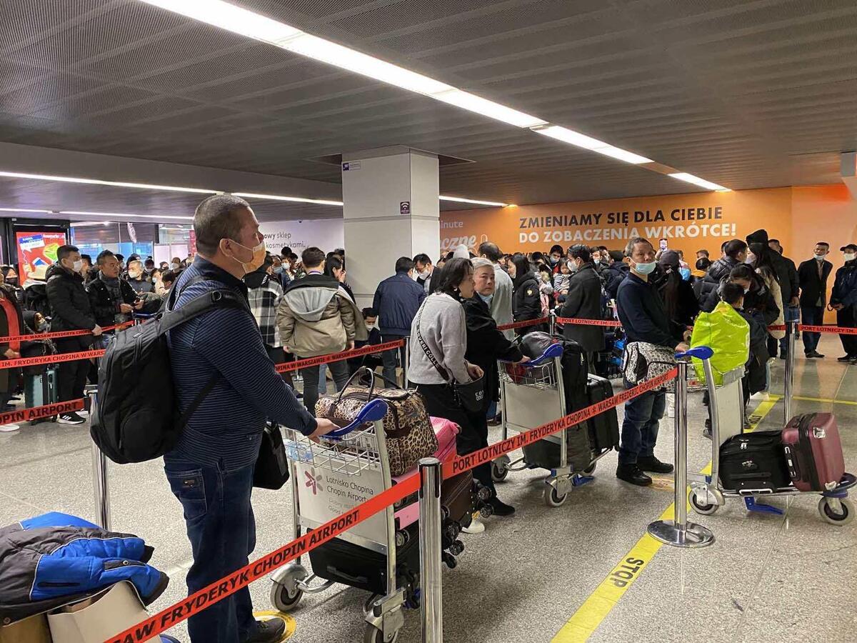 Người dân xếp hàng lên chuyến bay giải cứu tại sân bay Warsaw, Ba Lan.