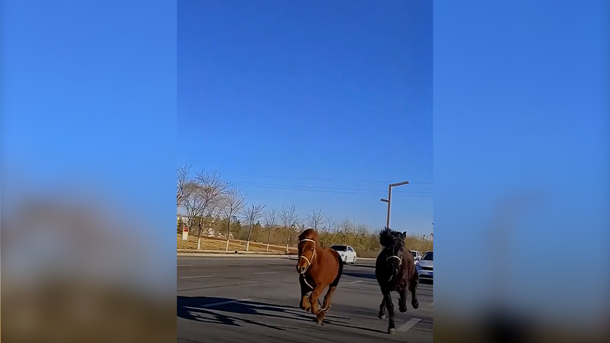 Bằng cách nào đó, hai con ngựa xuất hiện và phi nước đại giữa các phương tiện trên đường cao tốc ở miền bắc Trung Quốc.