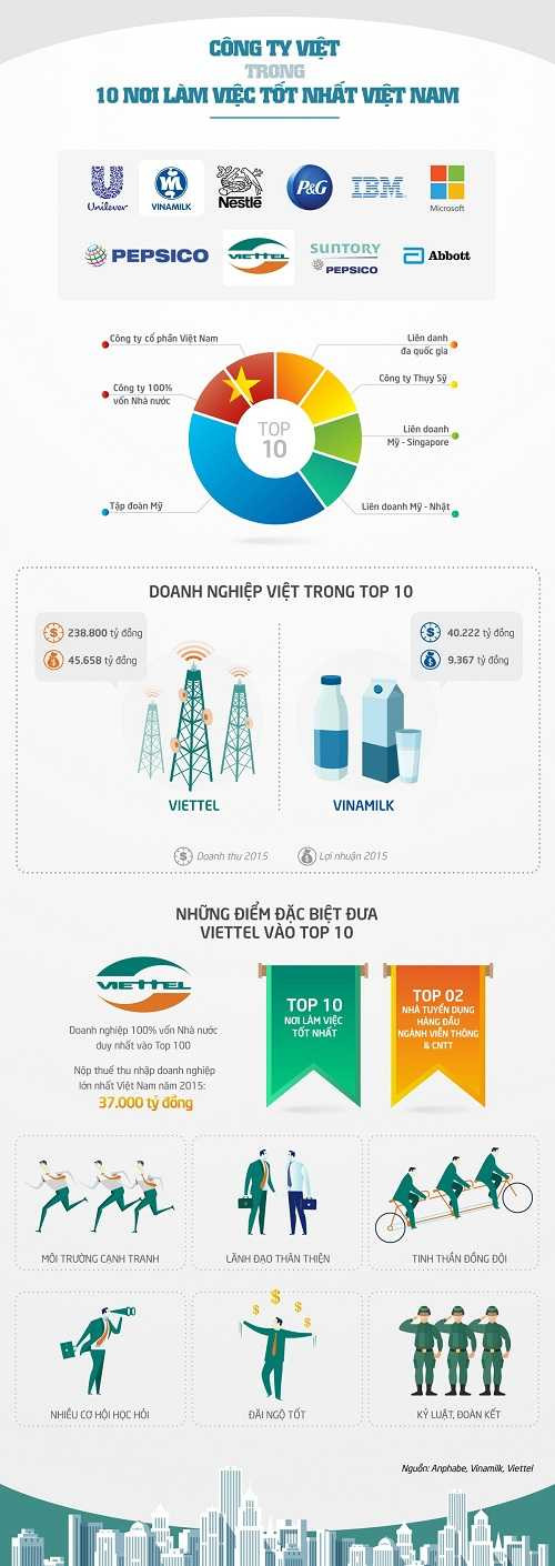 Năm 2015, Viettel và Vinamilk là 2 công ty trong nước có tên trong danh sách 10 nơi làm việc tốt nhất Việt Nam.