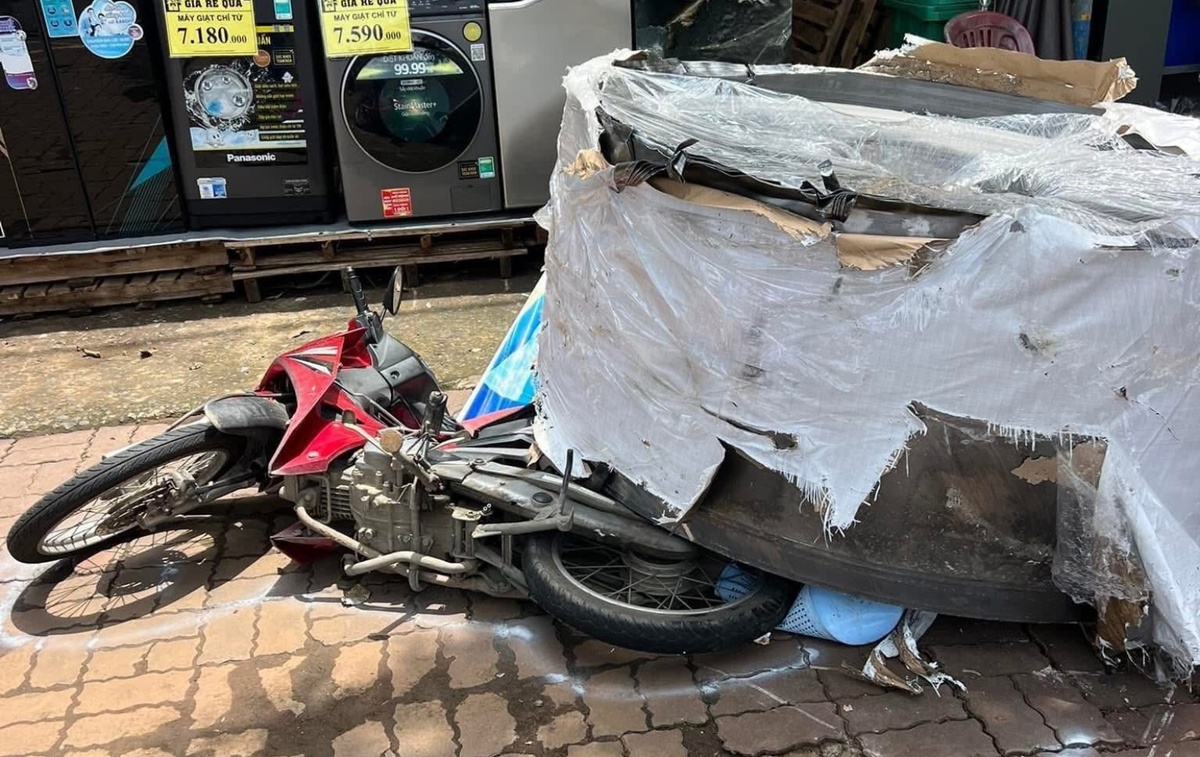 Một cuộn trượt dài ra vệ đường rồi dừng lại, cuộn còn lại lao thẳng vào khu vực cửa hàng Điện máy Xanh, đè bẹp chiếc xe máy dựng phía trước. Rất may thời điểm xảy ra sự cố không có ai đứng gần nên không gây thương vong.