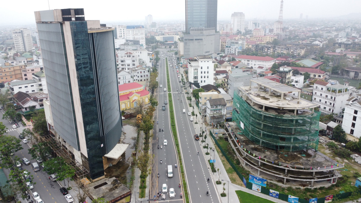 Dự án Bệnh viện Đa khoa Quốc tế Huế (trái) và dự án Tổ hợp toà nhà làm việc (phải) toạ lạc ở khu đất đối xứng nhau ở nút giao Hà Nội - Lý Thường Kiệt - Nguyễn Tri Phương (một trong những khu đất trung tâm và đắc địa bậc nhất của TP Huế) nhưng nhiều năm nay xây dựng ì ạch, chậm tiến độ gây lãng phí tài nguyên đất.