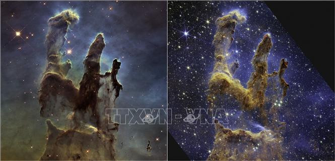 Hình ảnh "Cột trụ của Tạo hóa" do kính viễn vọng không gian James Webb chụp (phải) và hình ảnh "Cột trụ của Tạo hóa" được chụp năm 2014 bởi kính viễn vọng không gian Hubble (trái). (Ảnh: AFP/TTXVN)