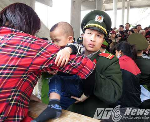 Chiến sỹ công an bế cháu bé thoát khỏi dòng người chen lấn để được ưu tiên đi trước