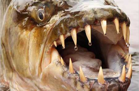 | Cá hổ Tigerfish Goliath có bộ răng hình tam giác rất sắc nhọn. Những chiếc răng đan cài vào nhau như lưỡi kéo. |