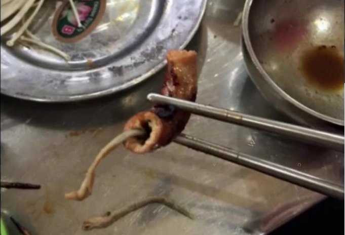 Hãi hùng sinh vật lạ dài ngoằng trong lòng lợn ở quán nướng