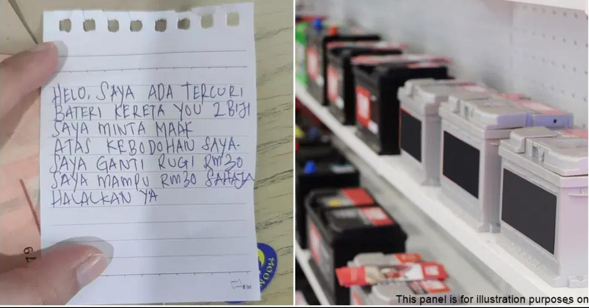 Tên trộm ắc quy để lại lá thư và số tiền 30 ringgit.