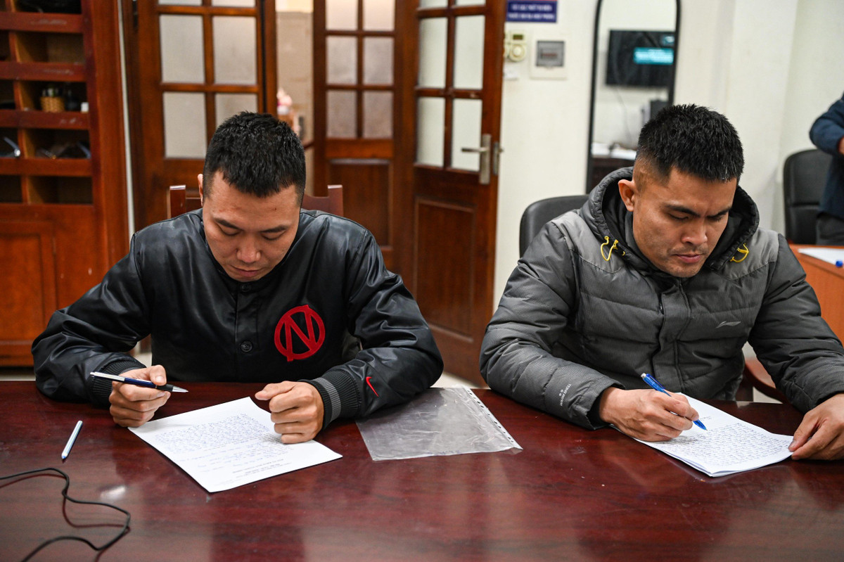 Trái với hình ảnh hung hăng như trong clip được chia sẻ trên mạng xã hội, 2 người đàn ông cúi gằm mặt, ngồi lặng lẽ viết từng lời khai ở trụ sở công an phường.