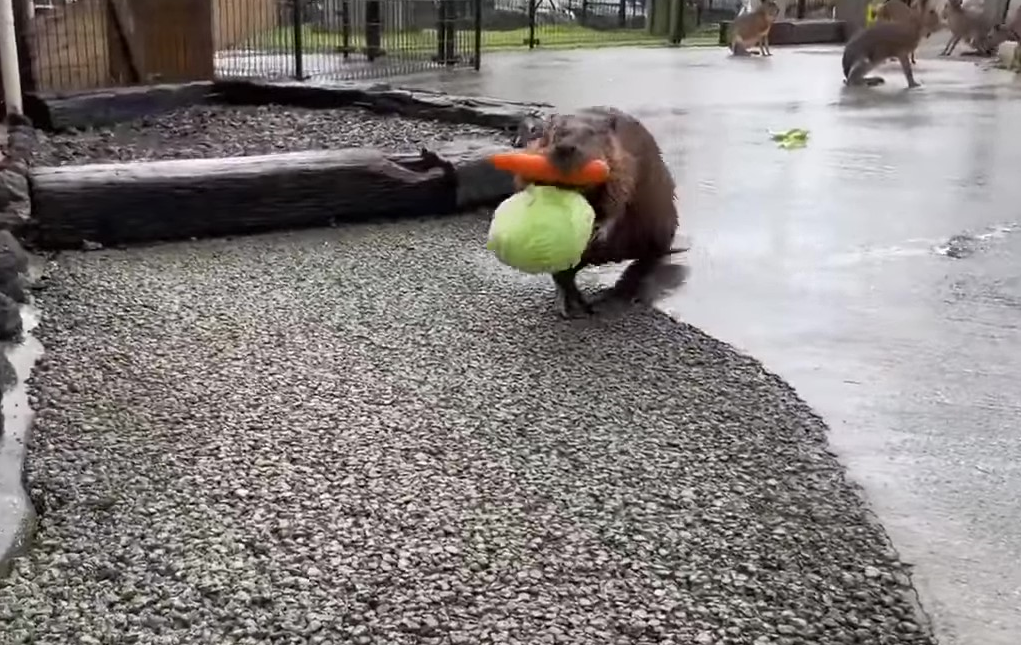 Đi được một đoạn đồ ăn lại lăn xuống đất khiến chú hải ly phải vất vả nhặt lên để tiếp tục di chuyển.