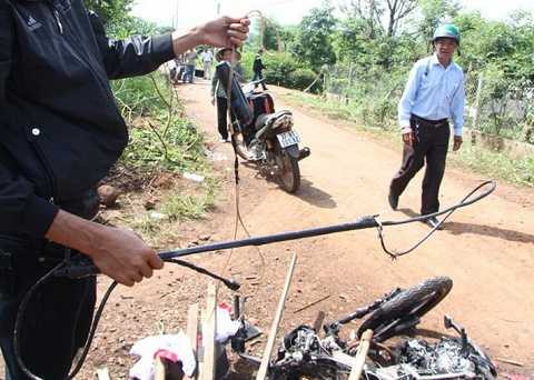 Tại hiện trường, chiếc xe máy hiệu Sirius mang biển số giả bị đốt cháy, trong người những người này có ớt bột, dây thòng lọng để bắt chó, pin độ chế kích điện, đèn pin, ná cao su và nhiều viên đá nhỏ…