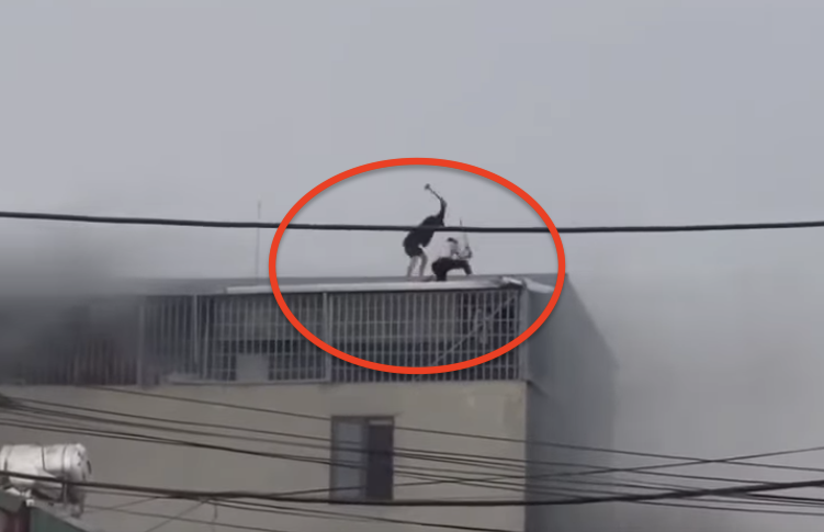 Theo một clip được chia sẻ trên mạng xã hội, bất chấp khói đen dày đặc, 2 người đàn ông trèo lên mái nhà, dùng búa gắng sức phá mái tôn, tạo lối thoát cứu người mắc kẹt bên dưới. Khi tạo được lối thoát hiểm, người đàn ông áo trắng mang thang tới, đưa nhiều nạn nhân mắc kẹt bên dưới lên mái nhà để thoát khỏi nguy hiểm.