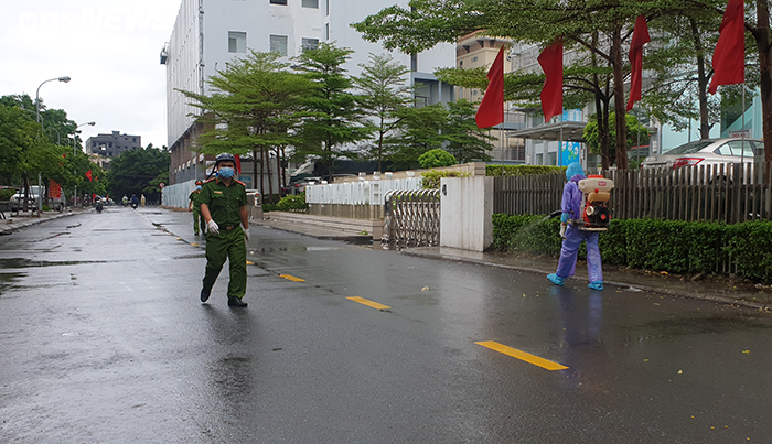 Đoạn đường Nhà thương lối vào Bệnh viện Đa khoa Quốc tế Hải Phòng được phong tỏa sáng cùng ngày, nhân viên y tế phun thuốc khử khuẩn xung quanh khu vực bệnh viện.