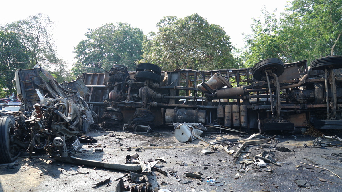 Cú va chạm mạnh làm xe tải chở hạt điều lật ngang, cả hai xe đều bốc cháy dữ dội.