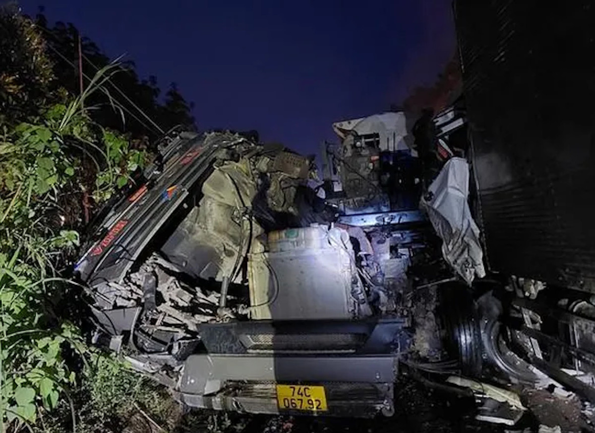 Tại hiện trường, 2 xe tải va chạm mang BKS 29H-810.xx và 74C-067.xx bị hư hỏng nặng phần đầu xe, nằm chiếm 1 làn đường.