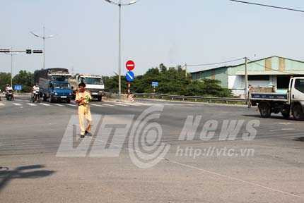 Lực lượng CSGT xử lý hiện trường tại giao lộ Cao tốc Trung Lương- TPHCM và đường Trần Đại Nghĩa ( Ảnh: PN)