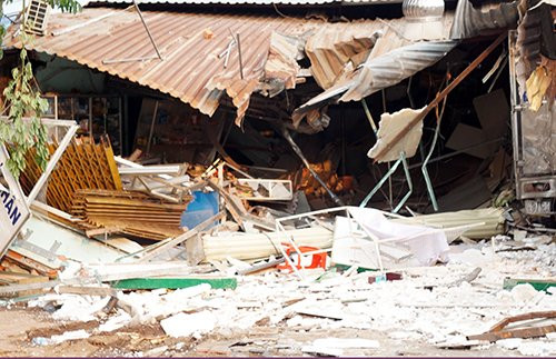 Cú tông mạnh làm hai ôtô cùng lúc lao vào lề đường, tông sập cửa hàng điện thoại của ông Lê Đình Cam (46 tuổi). Người đàn ông cùng vợ và con trai (10 tháng tuổi) bị chôn vùi dưới đống đổ nát, được mọi người bới tìm đưa ra ngoài, chuyển đi cấp cứu cùng với 2 tài xế.